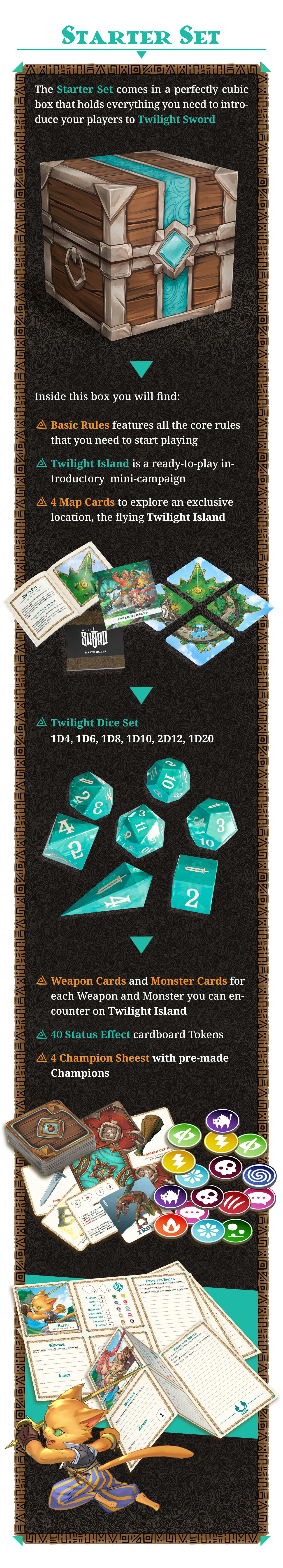The Starter Set comes in a perfectly cubic box that holds everything you need to introduce your players to Twilight Sword. Inside this box you will find: