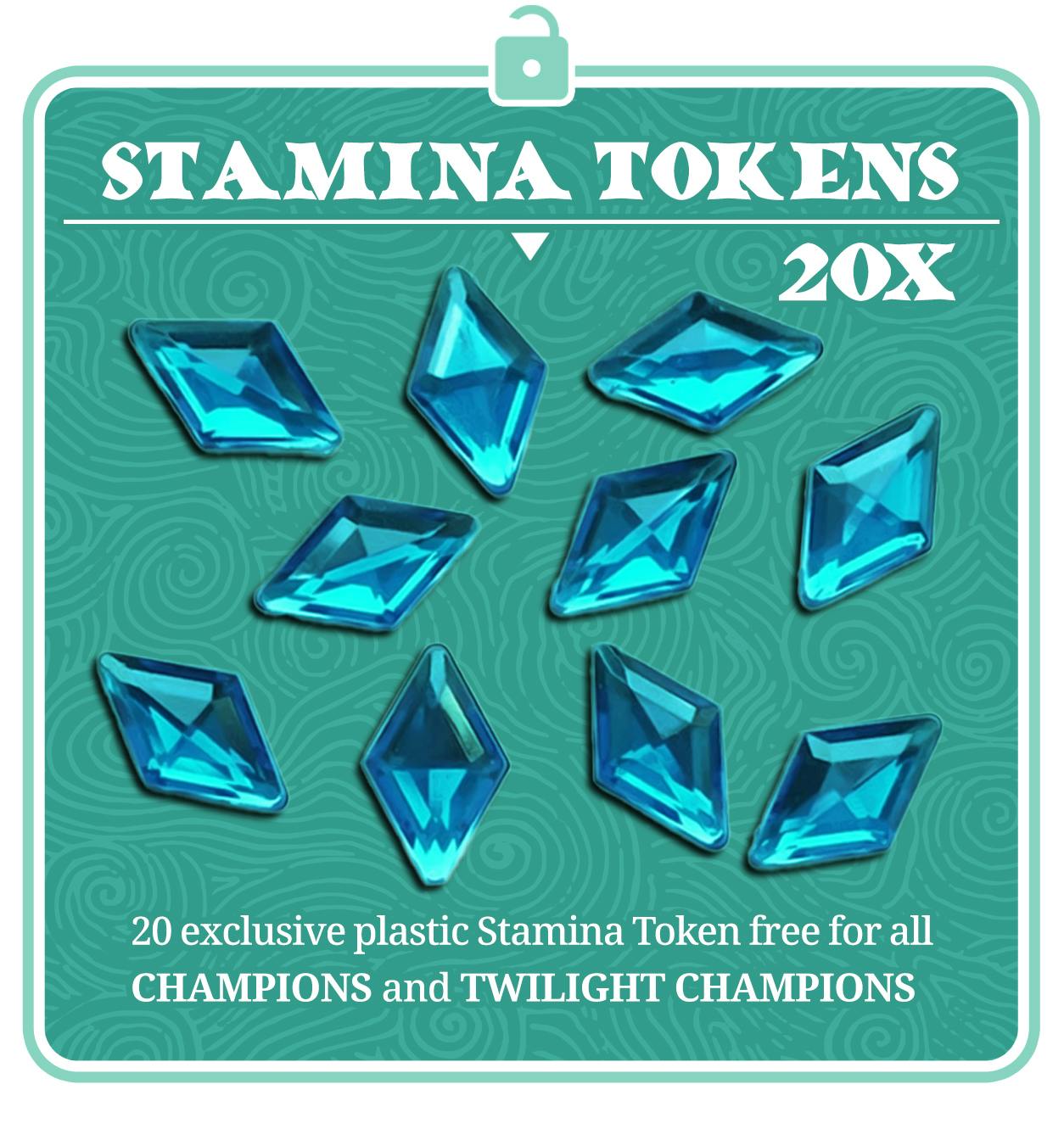 20 gem-shaped plastic tokens to keep track of your Stamina. These tokens are now also available as add-on