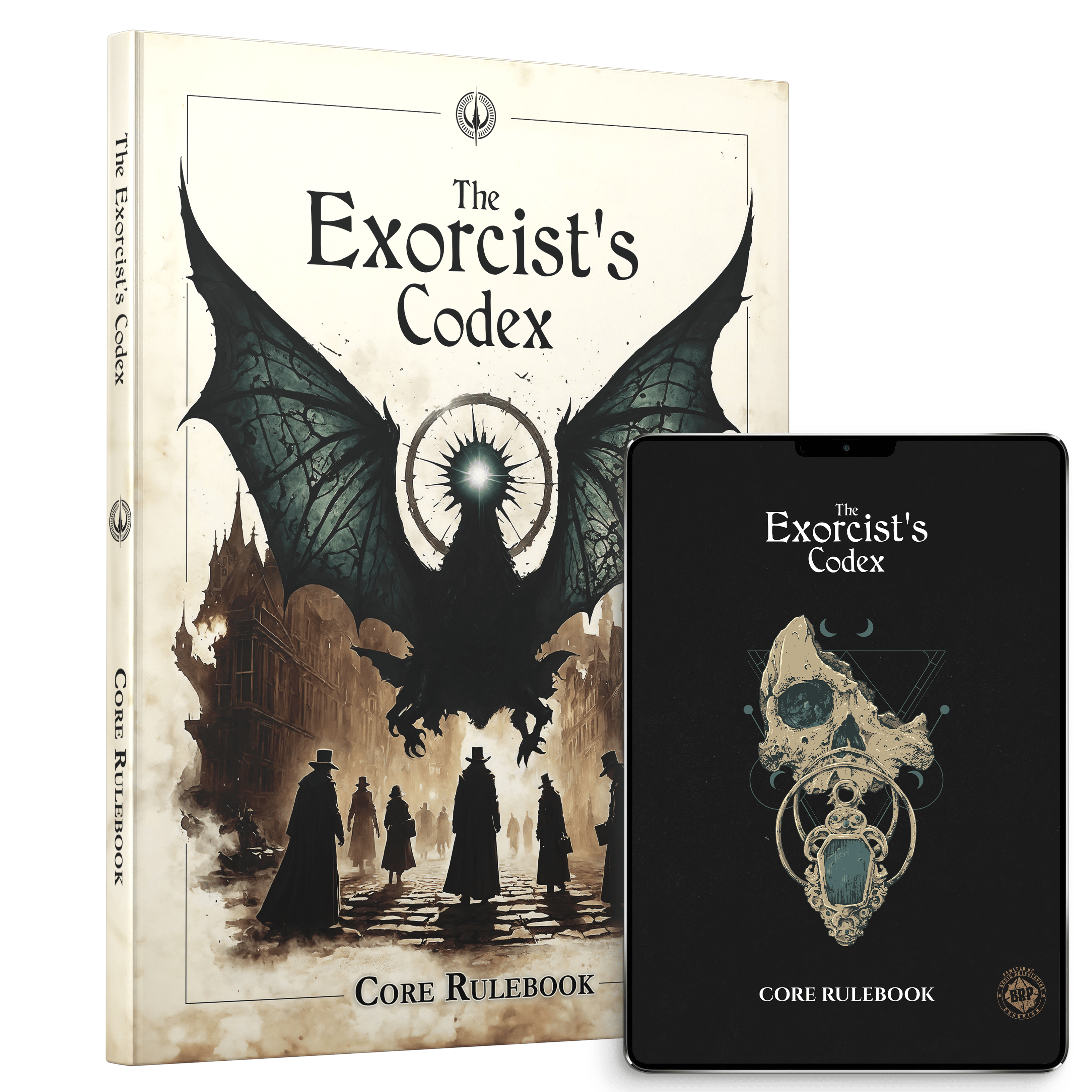 The Exorcist’s Codex is set in a dark horror 1890s setting, where players confront demonic beings, cultists, possessions, and intricate demonic schemes. Built on Chaosium’s BRP system, it introduces new mechanics like Holy Faith, Demonic Corruption, and Spirit Points, which shape characters' abilities and resilience. Players, as Agents of ancient Orders, rely on the Codex—a collection of rituals, powers, and lore—and seek out its fragments and Ancient Artifacts to combat demonic forces.