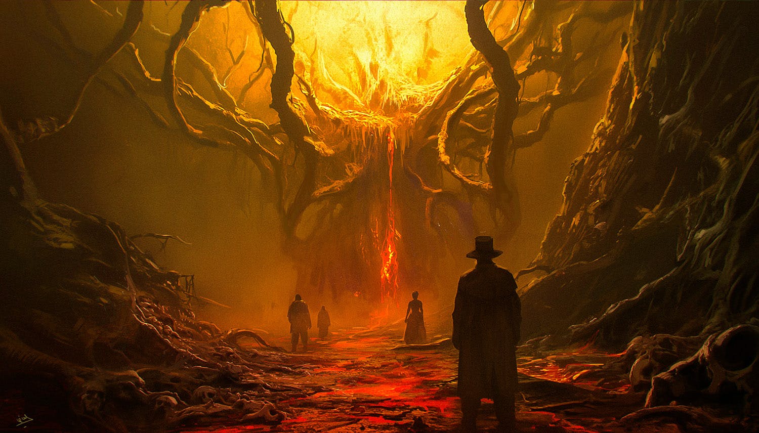 Enter the Demon's Realm (Art by Mohammad Yousefi) - The Demon Realms range from vast, pulsating swamps filled with fleshy, organic growths, to dim, planetary worlds where the sun is faint, casting only minimal light.
