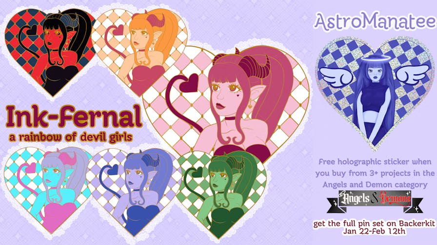 Finishing off this pin share with some last few angel and demons pins. I love the wings on the Celestial Beetle from Celestial, this campaign also has a fantastic moth pin if you're a fan of angelic/celestial moths. And last but not least, the devil girls from Ink-Fernal are super cute, I love all the colors but especially the periwinkle one.