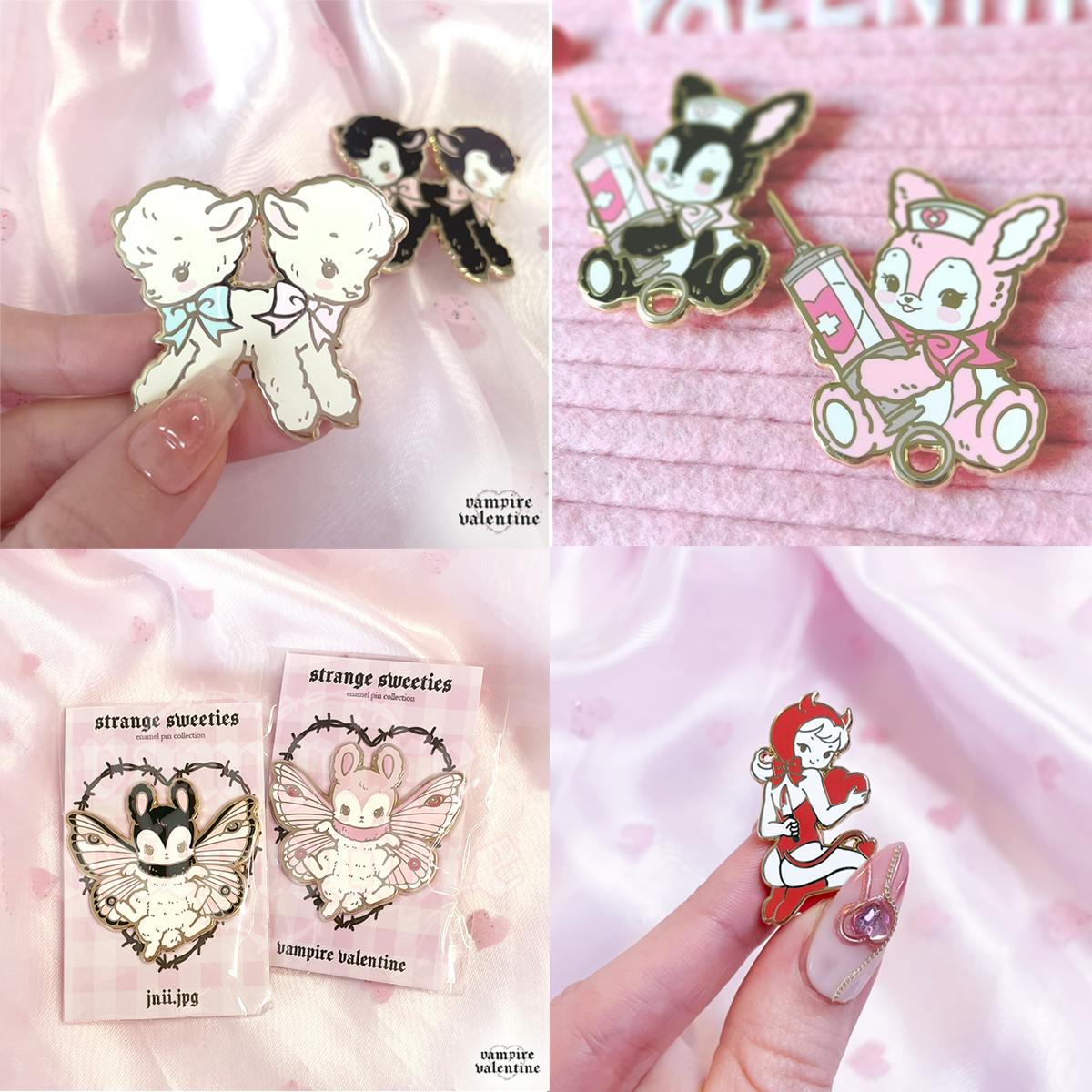 Expanding on the past crowdfunded "Strange Sweeties" enamel pin project, Vampire Valentine introduces a new whimsical kitsch pin series with a morbid medical twist.