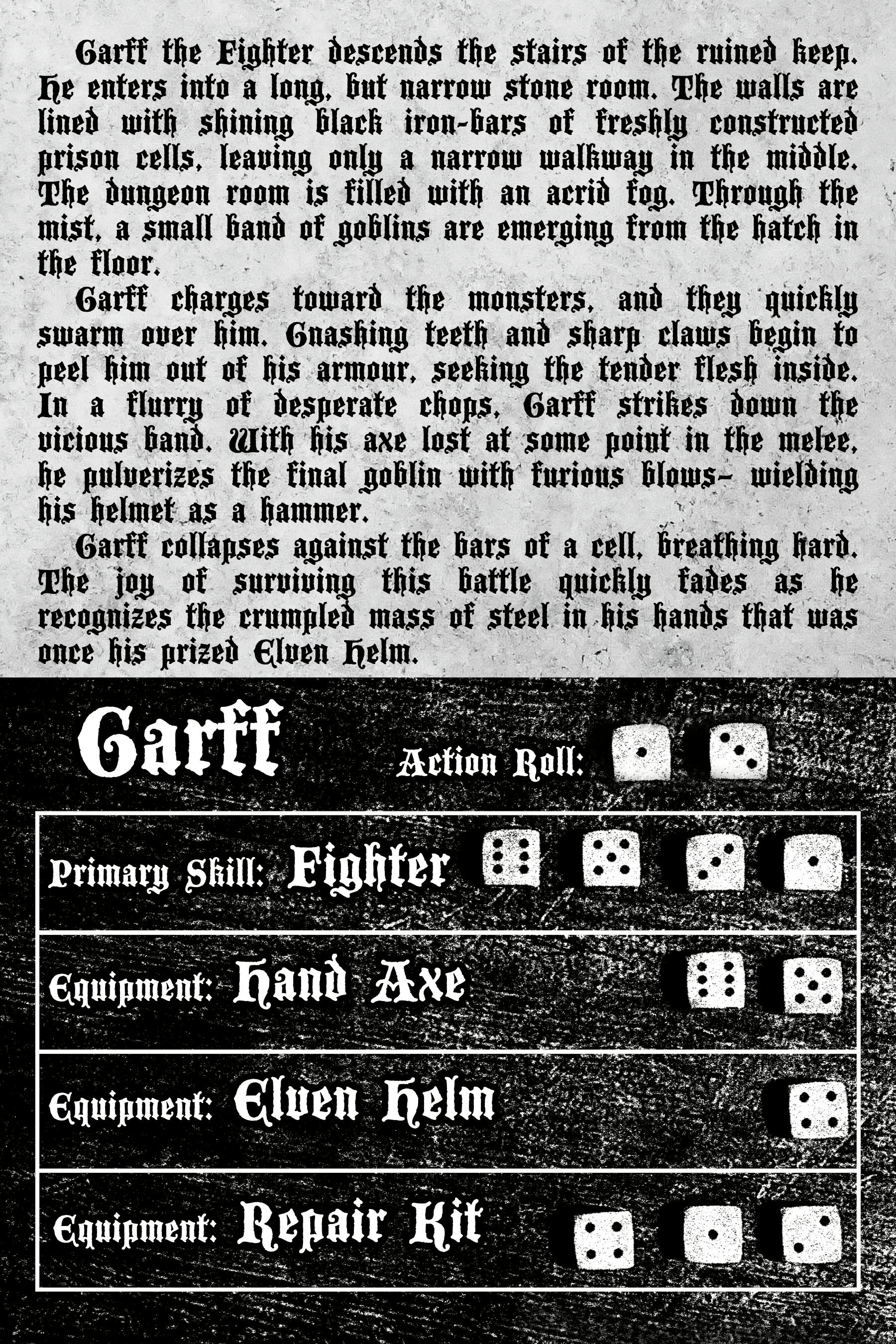 Mechanically - This game is inspired by Dark Fortby Pelle Nilsson, as a solo dungeon crawl RPG, and my own take on random adventure generation - the Adventure Matrix from Weird Heroes of the Great Outdoors- a setting for WHPA TV-13 RPG. I believe this will make for fun and challenging game, offering a unique experience with each play through.