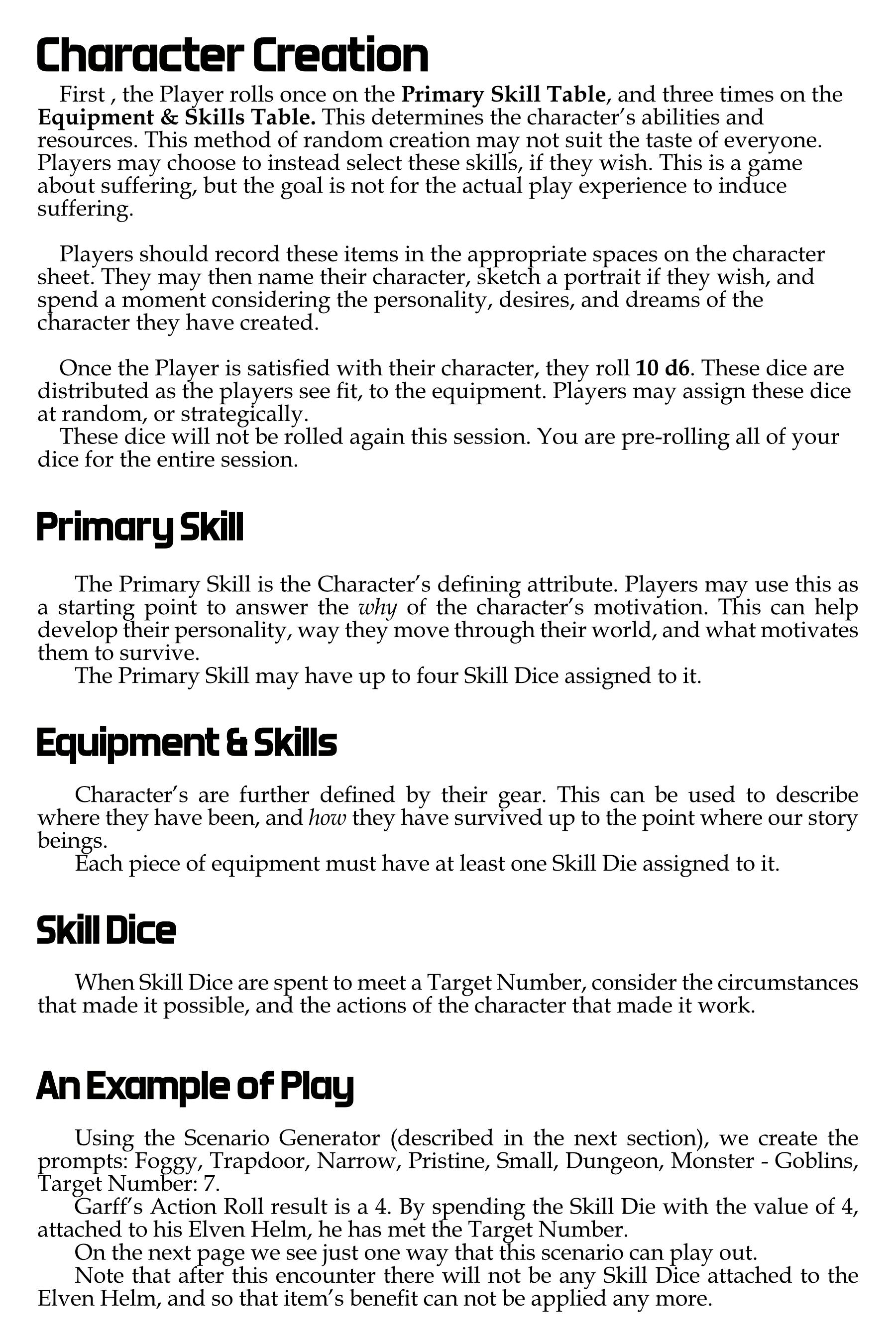 Gameplay - Random tables determine Character's Skills and Equipment. Dice are assigned to the Equipment. Conflicts are resolved by rolling dice to beat a target number. The equipment's dice can be added to the roll to meet the target. Will your luck (and dice) run out before you reach the end?