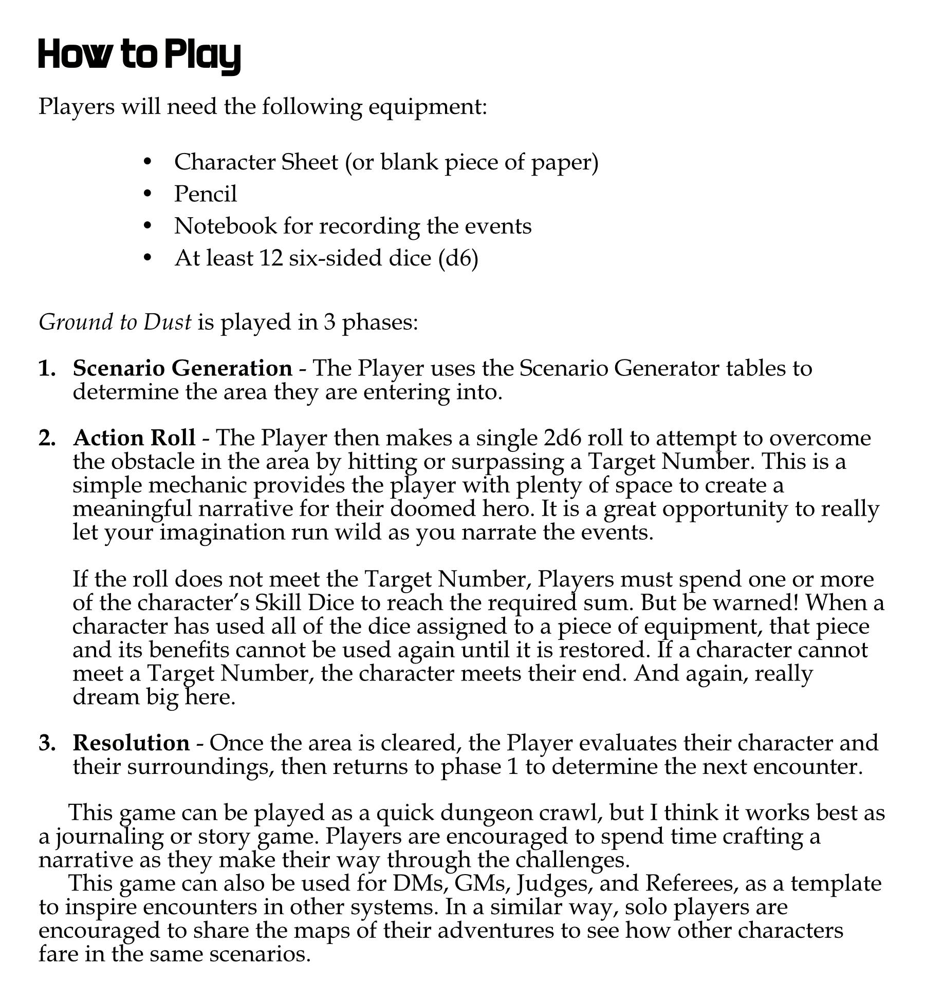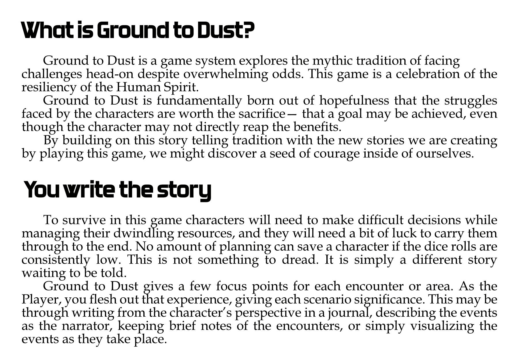 Ground to Dust is a roleplaying game for one-player that focuses on character choices as they manage dwindling resources to survive.