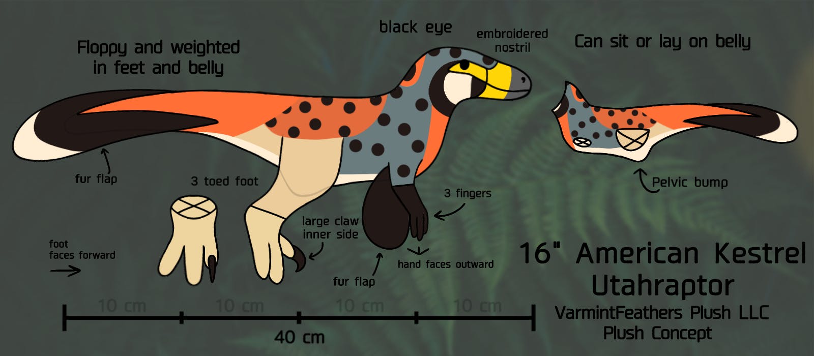 Dinosaurs. The giant, scaly monsters of the past. After all, Tyrannosaurus Rex literally means "Tyrant Lizard King!" At Varmintfeathers Plush LLC, that's not the picture we're trying to paint. Dinosaurs were an incredibly diverse caste of animals ranging from small insect eaters who could glide high in the canopy, to quick, agile road-runner-esque predators who hunted the proto mammals of the time, to the towering, leaf eating sauropods. Most of all however, dinosaurs were animals, just like the ones in our world today.