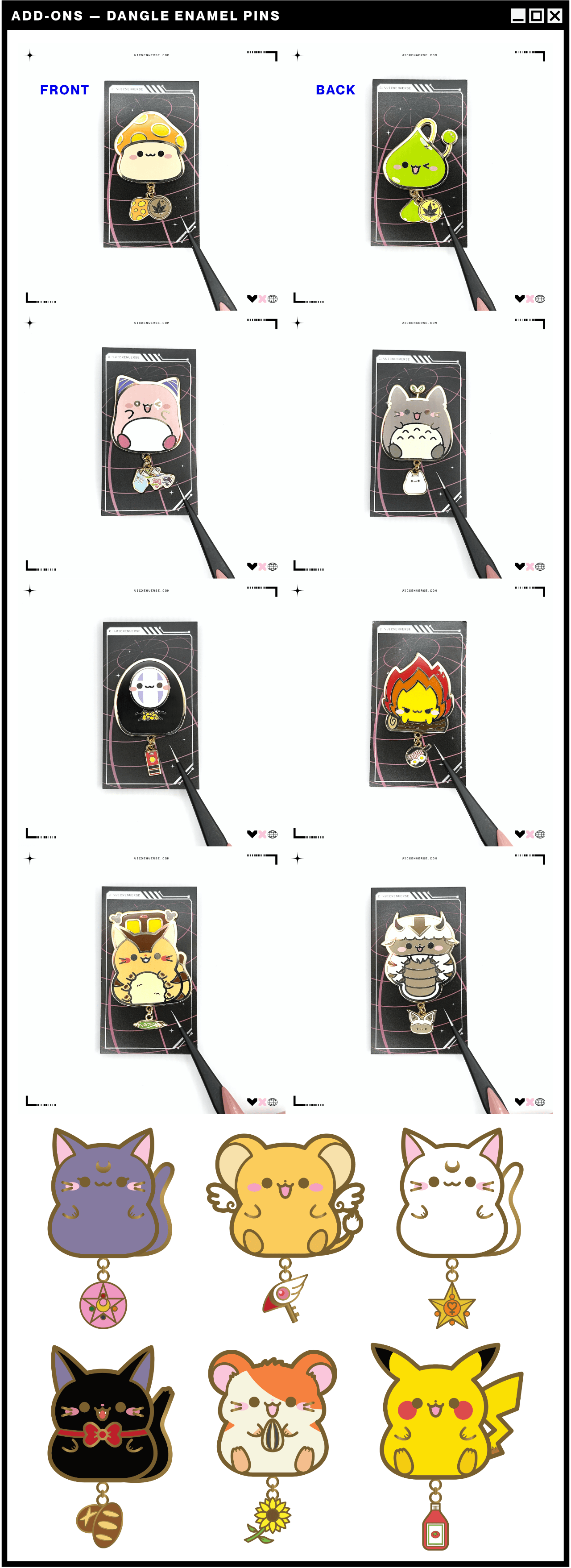 I'm happy to offer the original enamel pin series that inspired this chibi campaign! I've had many people ask for smaller versions of my designs, but this is for those who love the original larger pins. These dangle enamel pins includes a ~2" main charm with a 0.75" dangling accent charm that captures something special to each character.