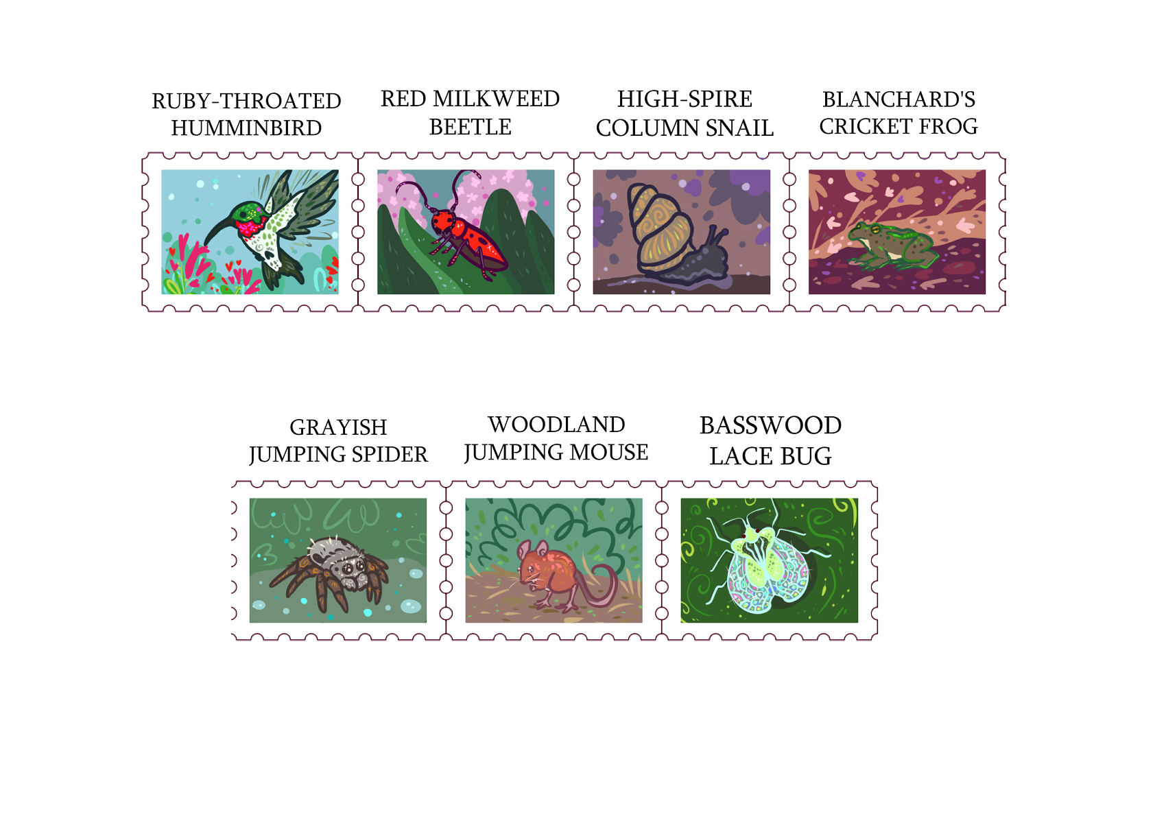 There were enough responses so the poll is closing and the new stretch goals have been added to the story section. Flying animal stamps came in first and has already unlocked, followed by pond foil washi, and then small animal stamps, which you can see the design for that below. In addition to that I have added an add-on for the turkey vulture design as a holographic sticker. The holo material for this will be "vaporwave" which is a lovely subtle holo material, and you can see the effect on the cicada stickers I have posted next to the vulture design below. I've also made a design for a sticker for the lace bug, I just love how their wings look. This will unlock as an add-on if the small animal stamp washi unlocks at $2200, and will have an effect similar to the dragonfly sticker next to it below. Both add-on stickers will measure about 3.5"
