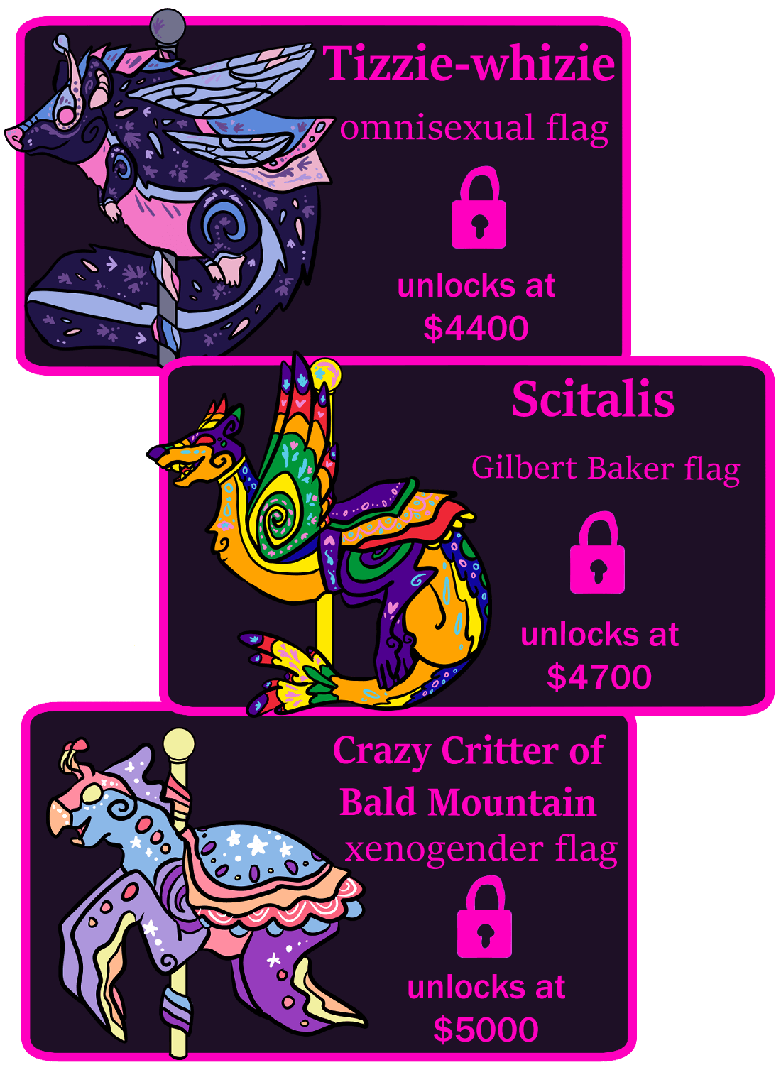 Hi, I'm Ion, aka Violet Magician. You can find me on Instagram, BlueSky, and Tumblr. I've been making sets of carousel themed pins for a bit now, and as part of pintopia last year did a pride flag themed cryptid carousel set. You can see these finished pins below. (these are all available as add-ons too)