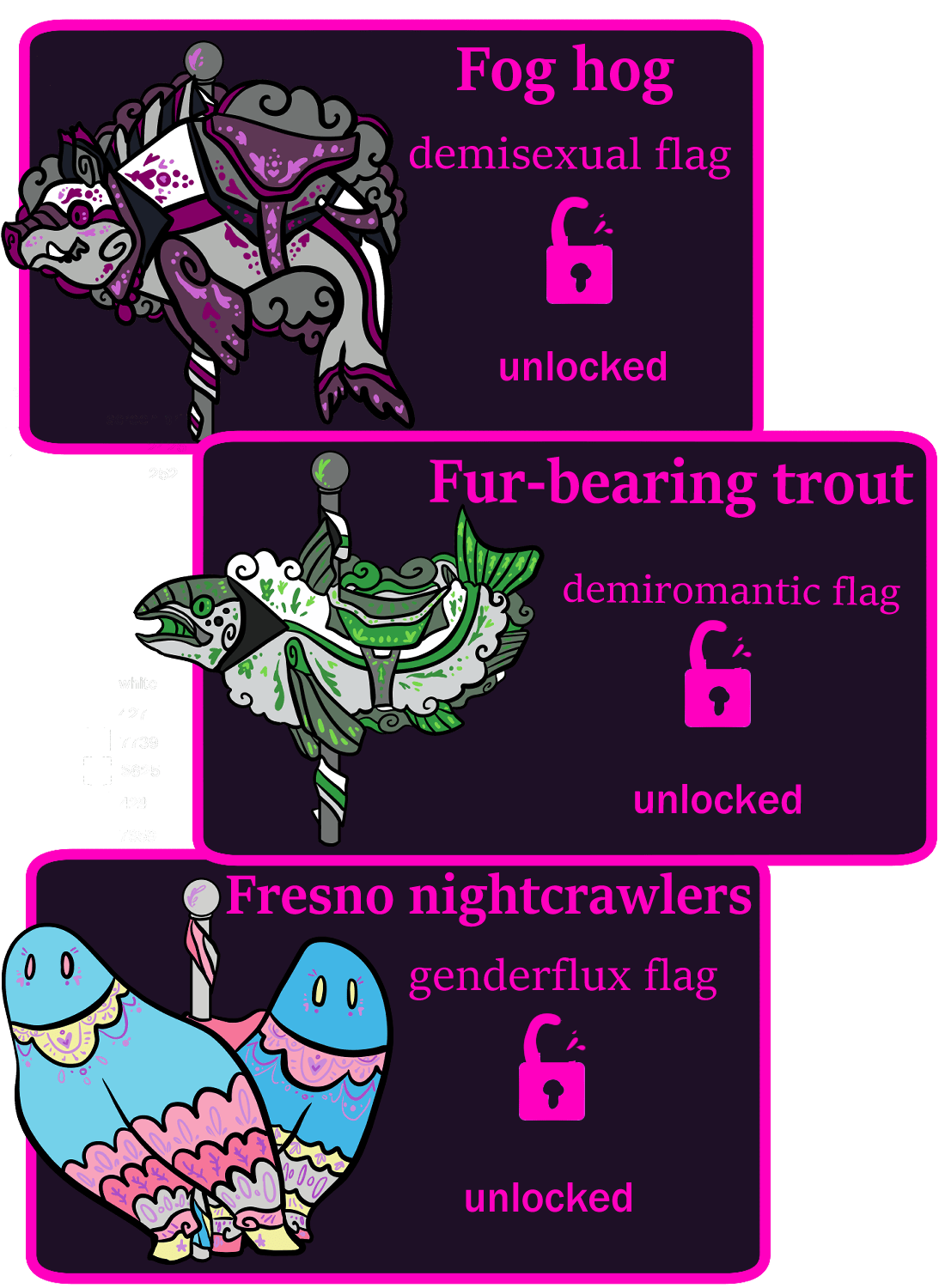 Anyone can also choose stickers as an add on. There are also some other add-ons available, including the remaining terrashot pins that were the collab pins from my first pride flag carousel campaign as well as previous carousel pins. It's possible I might add more add-ons, I will make an announcement if I do.
