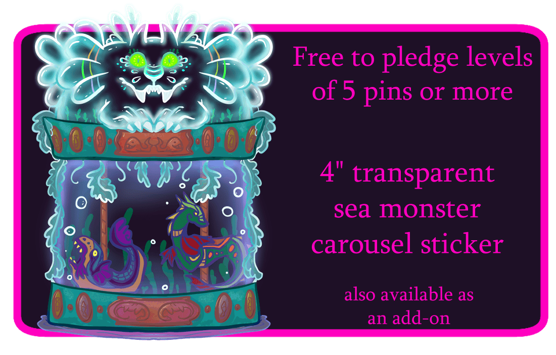 Anyone who pledges at a level of 5 pins or more (pledge level of 5, 10, 15, or 18 pins) will get a free transparent sea monster carousel sticker.