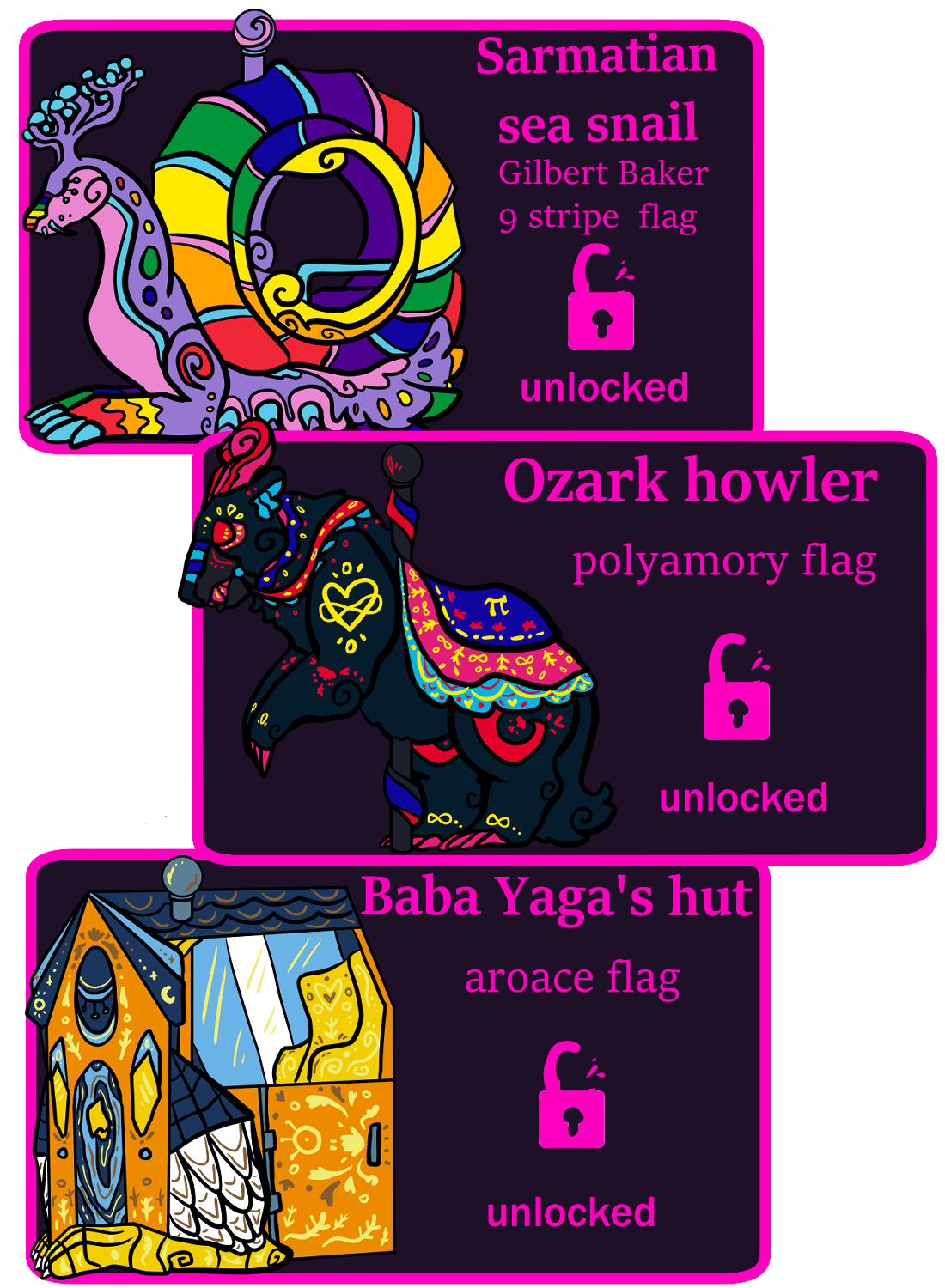 The new set for this campaign will get to some pride flags that weren't included in the last set with new cryptids and folklore creatures as well. Also, as part of pintopia I am part of the Lore and Myth banner, and if you back 3 projects that are part of that banner you'll get a free exclusive mini pin from each of the Lore and Myth campaigns you back.
