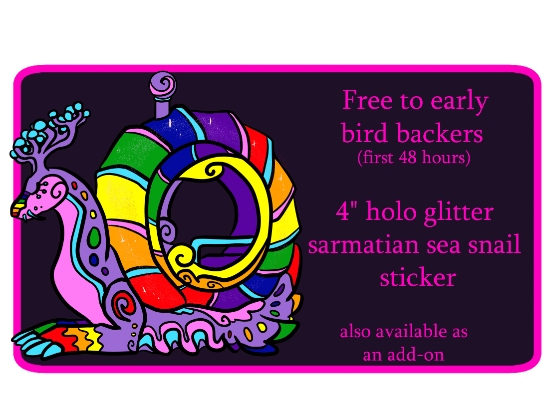 Early bird backers who back in the first 48 hours will receive a free sticker version of the Sarmatian sea snail design with a holographic shell.