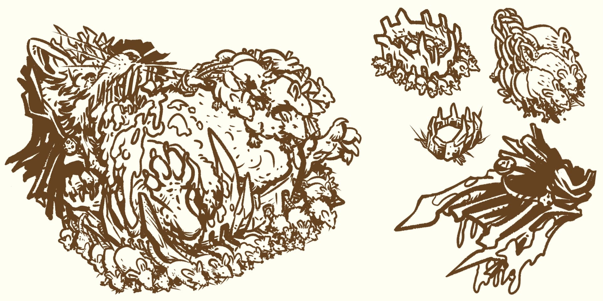 Some Unusually Sized Rodents are less communal-minded than their fellow rats. If allowed to remain in the colony, they slowly monopolize its resources, growing to tremendous size and ultimately unable to move under their own power. They lash their siblings into a giant rat king and force them to bear it about. The Musrattenkönig braids other rats from the colony into a meaty multi-rat mace that they flail at potential threats.