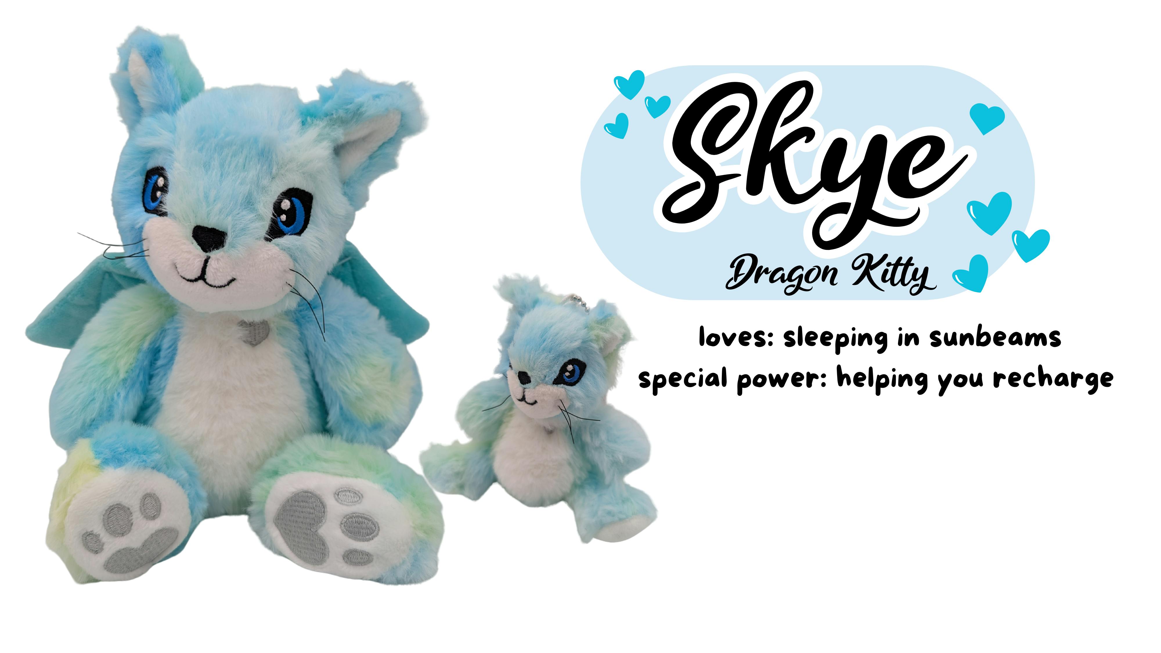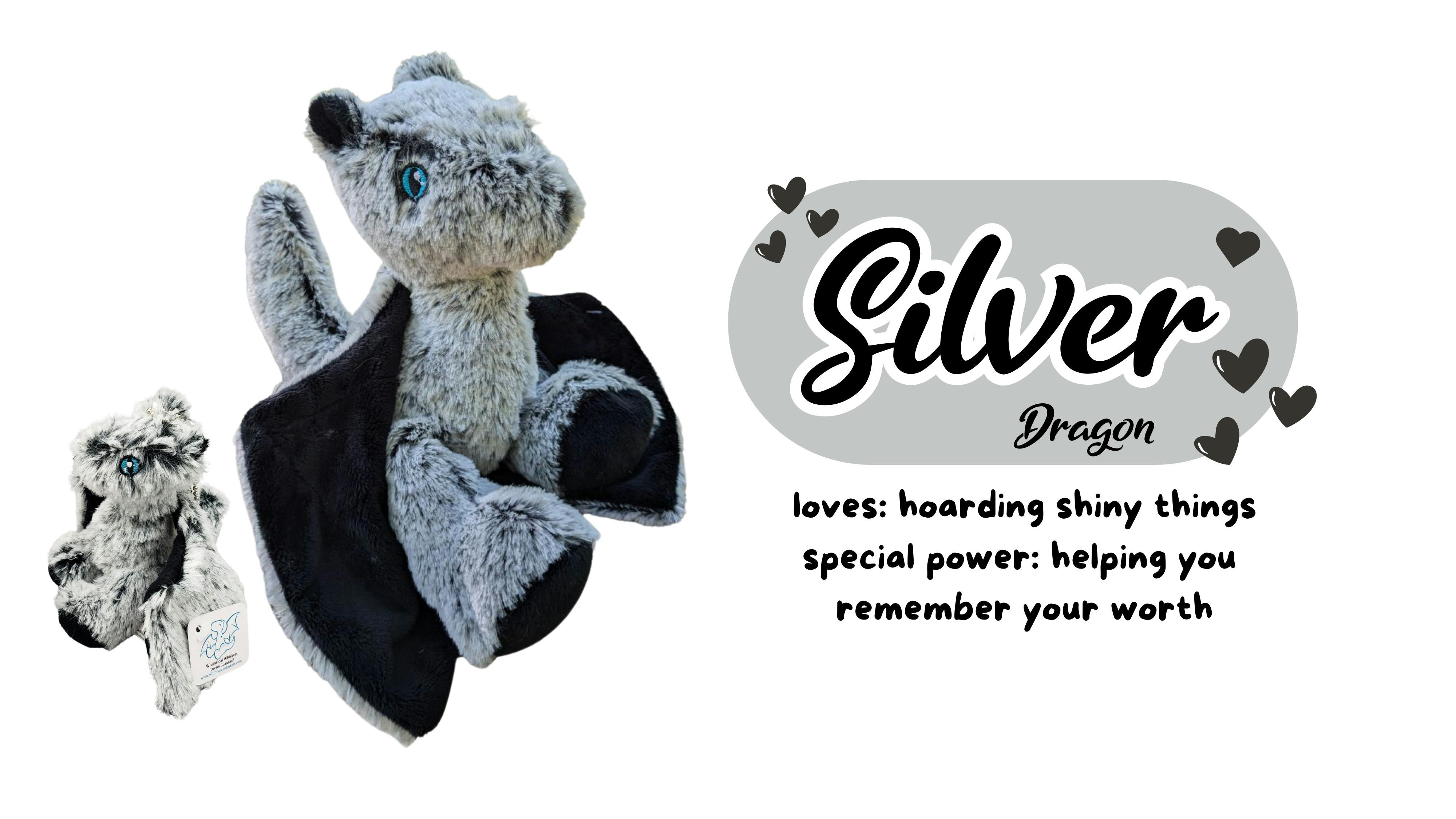 Our big dragons are 7'' tall (not including their ears!) and made of super soft, cuddly fabrics. All of our dragons have wings, embroidered eyes, and hearts on their chests. The new addition of embroidered heart paws and toe beans on some of the Dream Guardians make them even more special.
