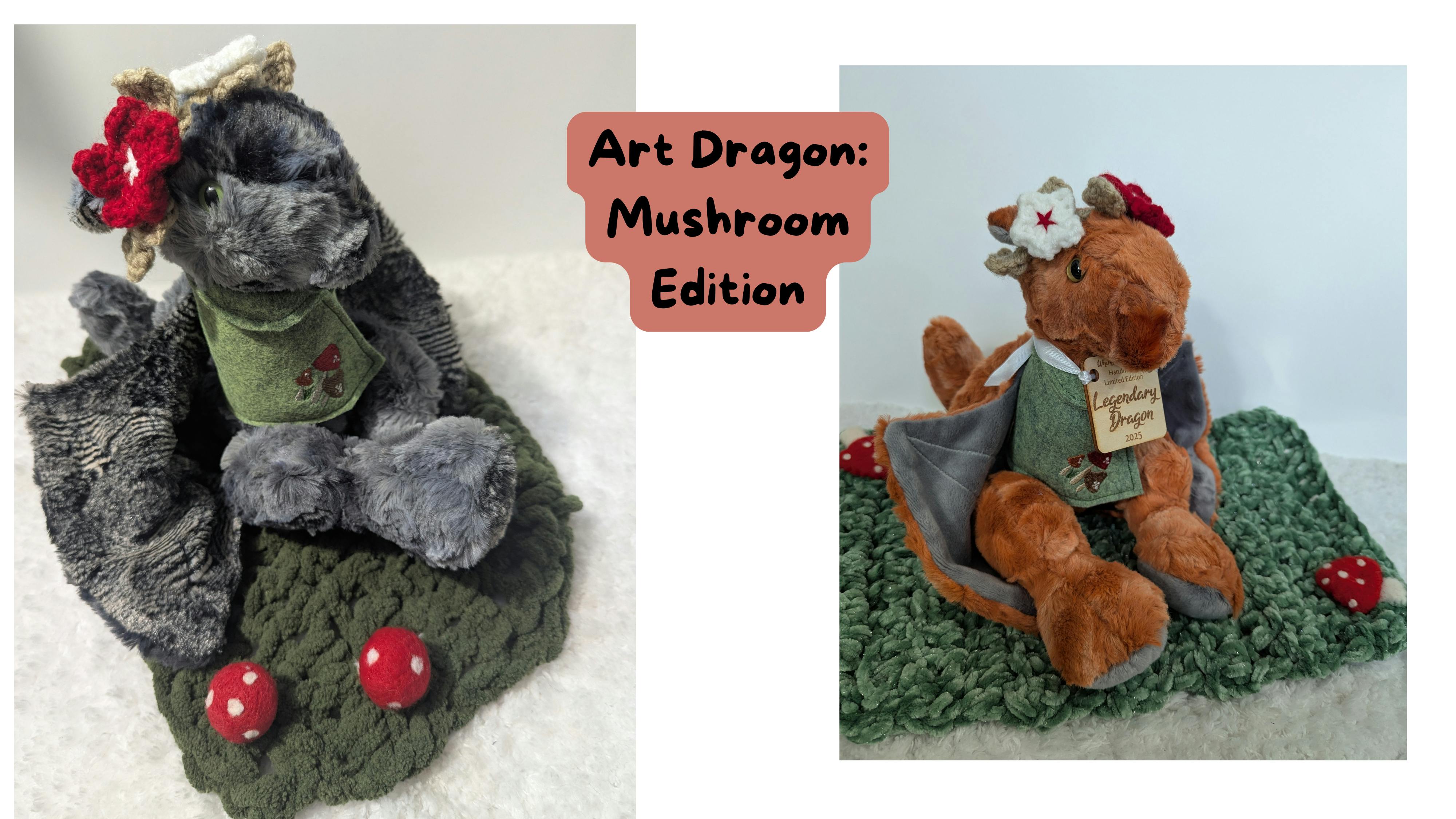 Choose your color (during the survey) for one Art Dragon -- Mushroom Edition! Dressed in an embroidered vest and one of a kind flower crown, sitting on top of a crochet mushroom mat, this dragon loves the forest, mushrooms, and all things whimsical and magical. Their special power is helping you remember to find those sunbeams even when the journey seems dark and long. **colors of dragon, mat, and flower crown will vary, since all are handmade and one of a kind. THIS ITEM MAY SHIP LATER AND IS NOT EXPECTED TO ARRIVE BEFORE THE HOLIDAYS. Choose from in stock colors of Handmade Legendary Dragons. Mat and flower crown will be unique and one of a kind, and will vary from photo.