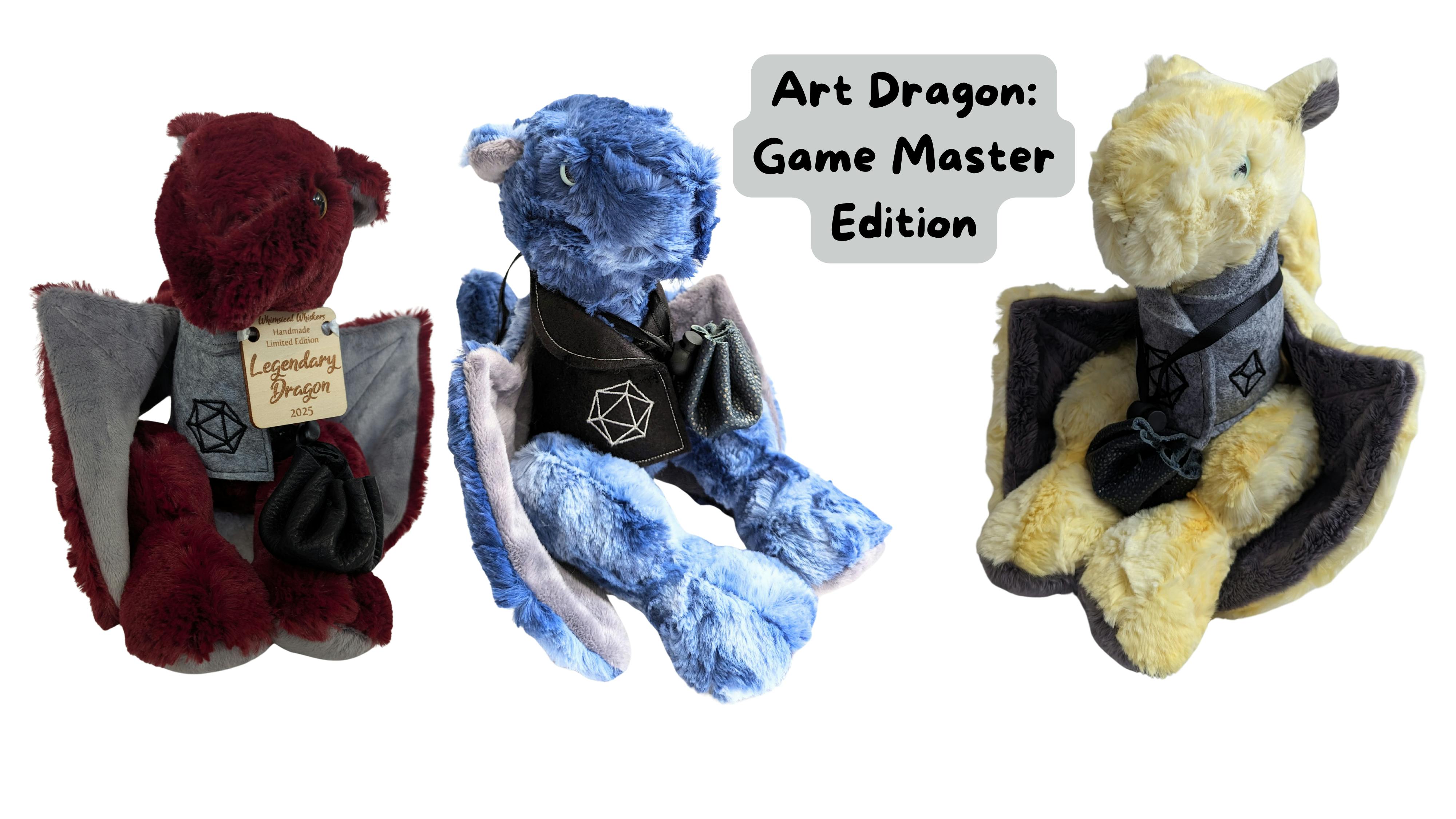 Choose your color (during the survey) for one Art Dragon -- Game Master Edition! Dressed in an embroidered vest, with little dice bag that folds out into a dice tray and a full set of miniature dice, this dragon is ready to bring luck to your table. Choose from in stock colors of Handmade Legendary Dragons.