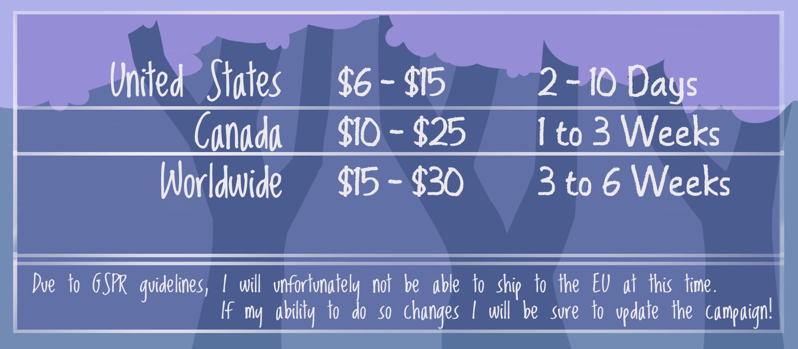 ✦ Buyer is responsible for all import taxes and fees. Backerkit will not collect this. ✦ Shipping costs are charged after the campaign through the Backerkit survey for accuracy based on location and number of items ordered. ✦ All orders will be shipped with tracking. Tracking will be delivered to the email you provided in the campaign. ✦ Shipping fees are all estimates based off of the postal cost knowledge I have now and are subject to change depending on the shipping rates when your shipping is paid. ✦ All shipping times are estimates. I am not responsible for any delays due to postal service or customs. ✦ Please double check your addresses! Backerkit or I are not responsible for lost or mis-delivered packages due to incorrect addresses.