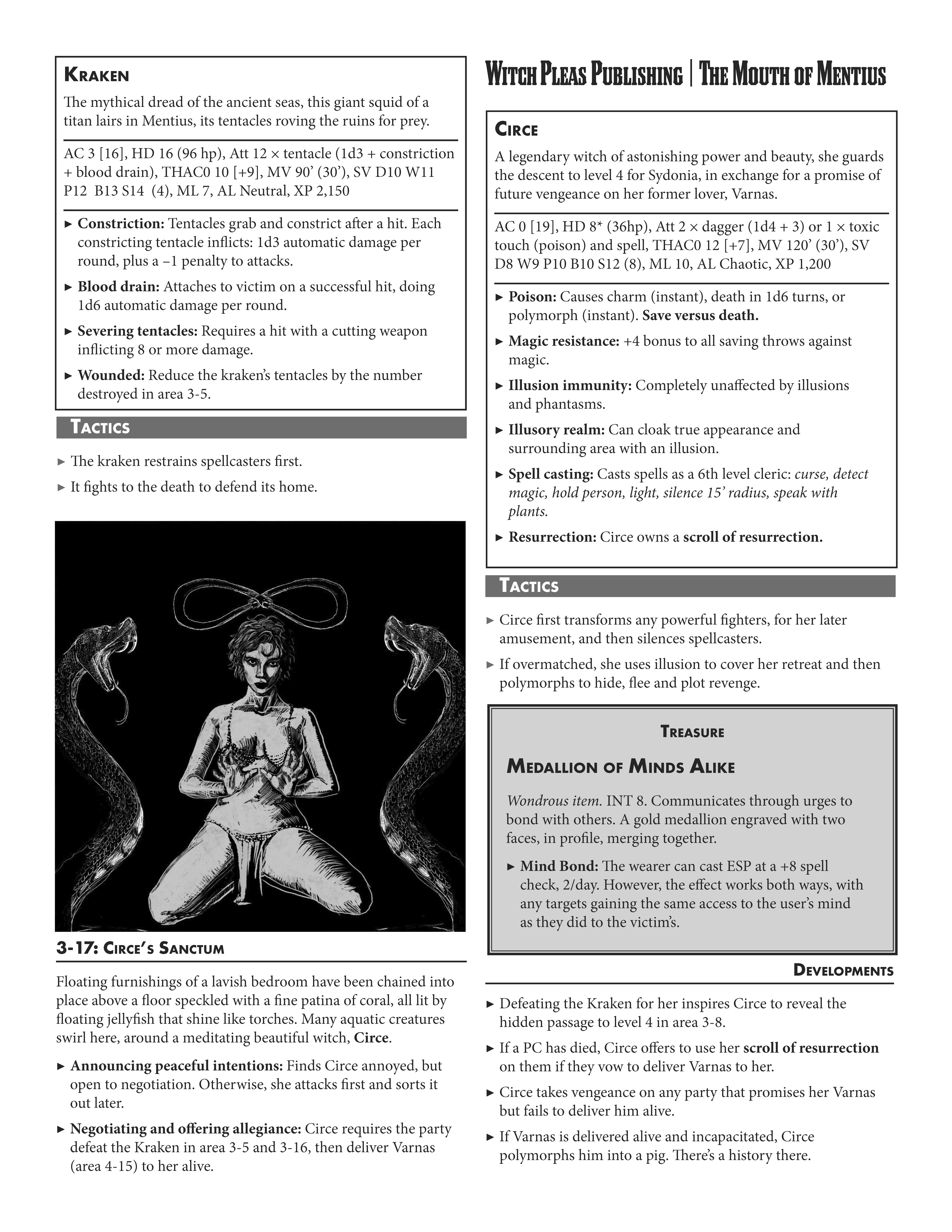 The characters have discovered an ancient underground palace where the Gods once hid their indiscretions and pleasures. But so have nigh-omnipotent aliens and their rival faction of cursed, corrupted witches. Fortunes that could sway the fate of worlds await being unearthed in The Mouth of Mentius - old-school dungeon crawling at its best featuring gods and monsters at their worst!
