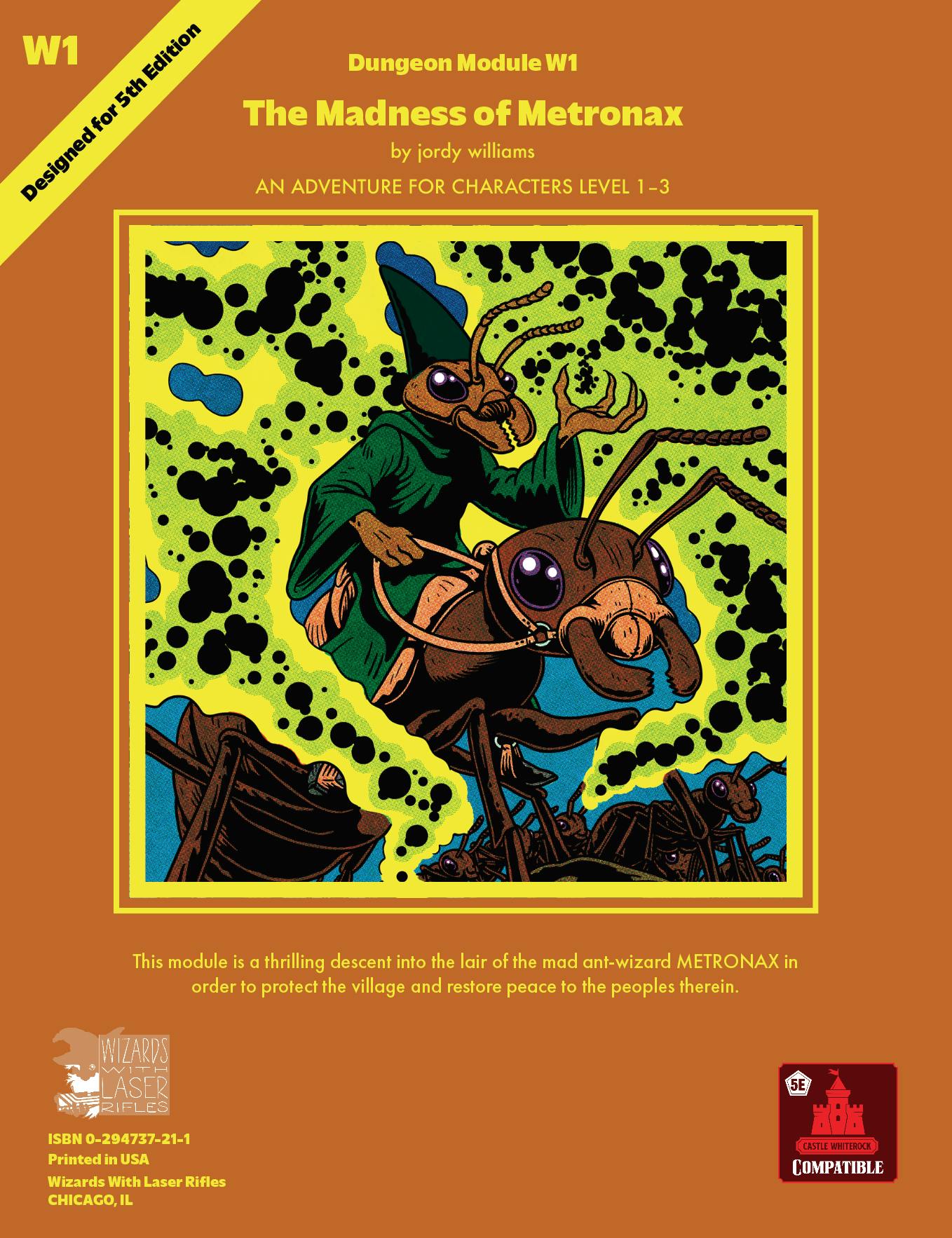 The Madness of Metronax is a low-level adventure for Dungeon Crawl Classics and 5e that increases ties between Castle Whiterock and nearby Cillamar. And it has magical giant ants!