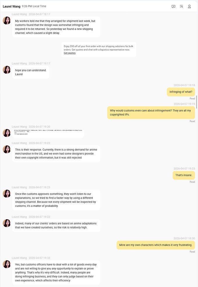 The second update is that the new pins have been delayed because the Chinese Customs Flag them as copyright infringing and required it to be returned. Which is crazy since I own the US copyright. Apparently, there has been a lot of artist ordering pins and acrylic standees that infringe on existing IPs lately and have just been flagging anything that looks like it could be an existing IP. Here is the full conversation with my rep if you want to read it.