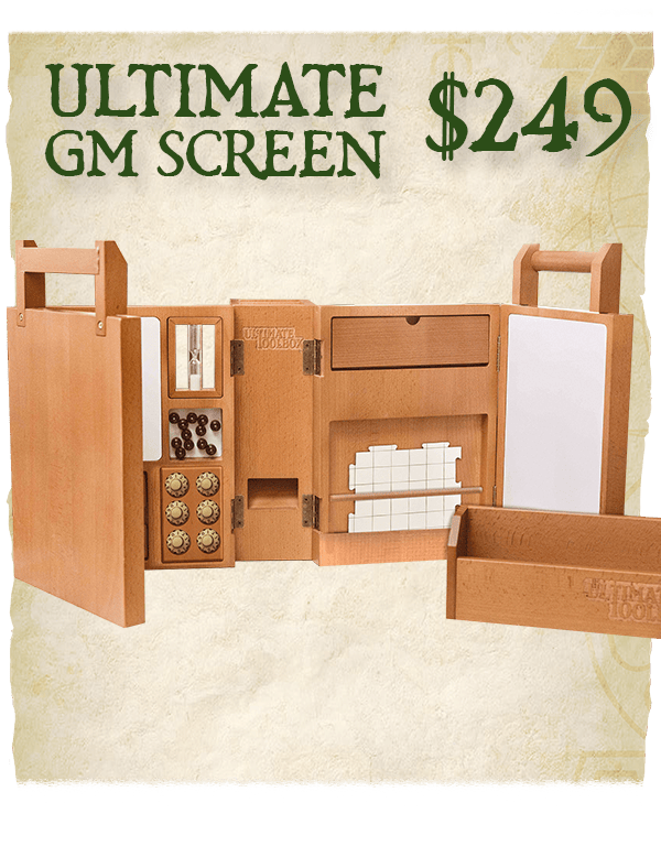 Ultimate GM Screen: Packed with features like magnetic whiteboards, a removable timer, dual-sided dice tower, tons of storage, and more - the Ultimate GM Screen was made by GMs, for GMs. Includes a starter pack of dungeon tiles.