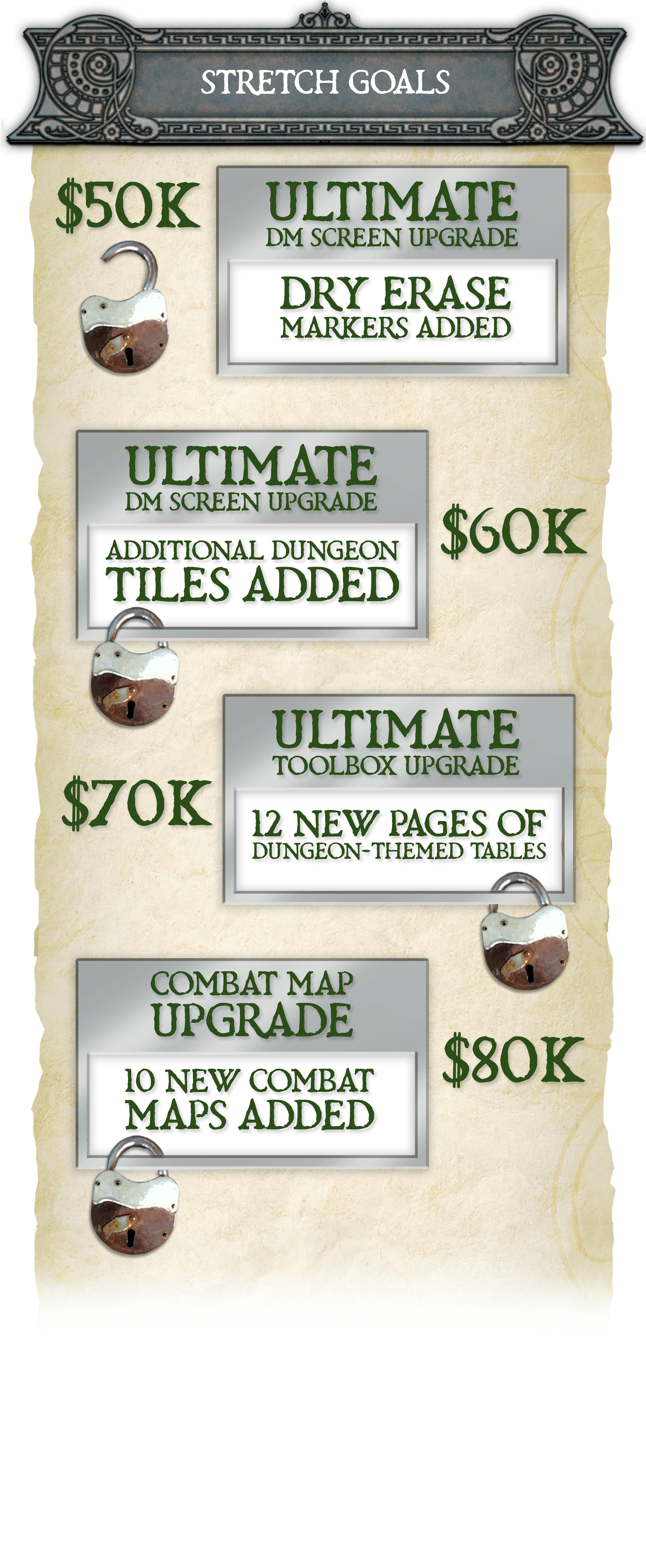 Modular Dungeon Tiles & Holder: Build endless dungeon layouts with these reusable tiles, neatly stored in their own holder right inside the screen. Each screen will include a starter pack of ten 3"x6" modular dungeon tiles - which will be upgraded based on unlocked stretch goals!