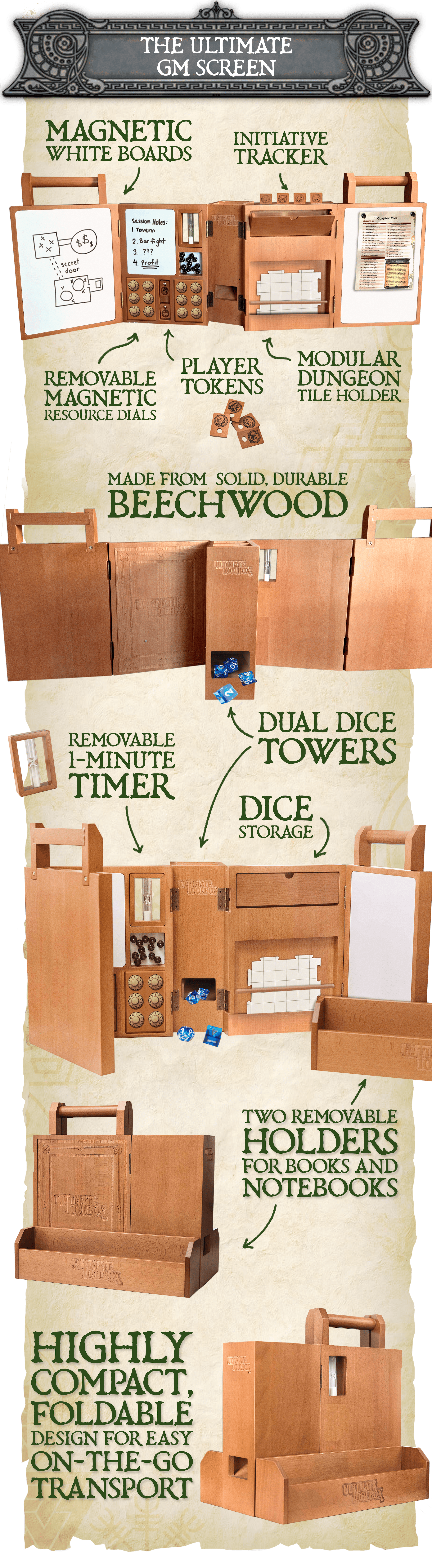 Alongside the Ultimate Toolbox, we've created a premium, wooden, foldable GM screen - designed to be as versatile as the book: the Ultimate GM Screen. Crafted from durable beechwood, this premium screen is sturdy, stylish, and functional, while folding up neatly with a built-in handle for easy storage and travel!
